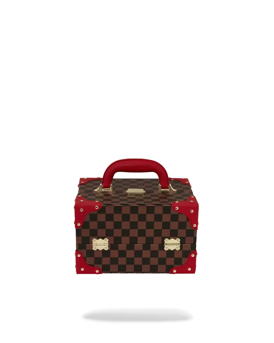 PRODUCT DETAILS Red Trims with Special Gold Hardware details 100% PU – embossed with Sprayground monogram Size 11, x 7, x 7, Red velour lining, Tiered shelving,