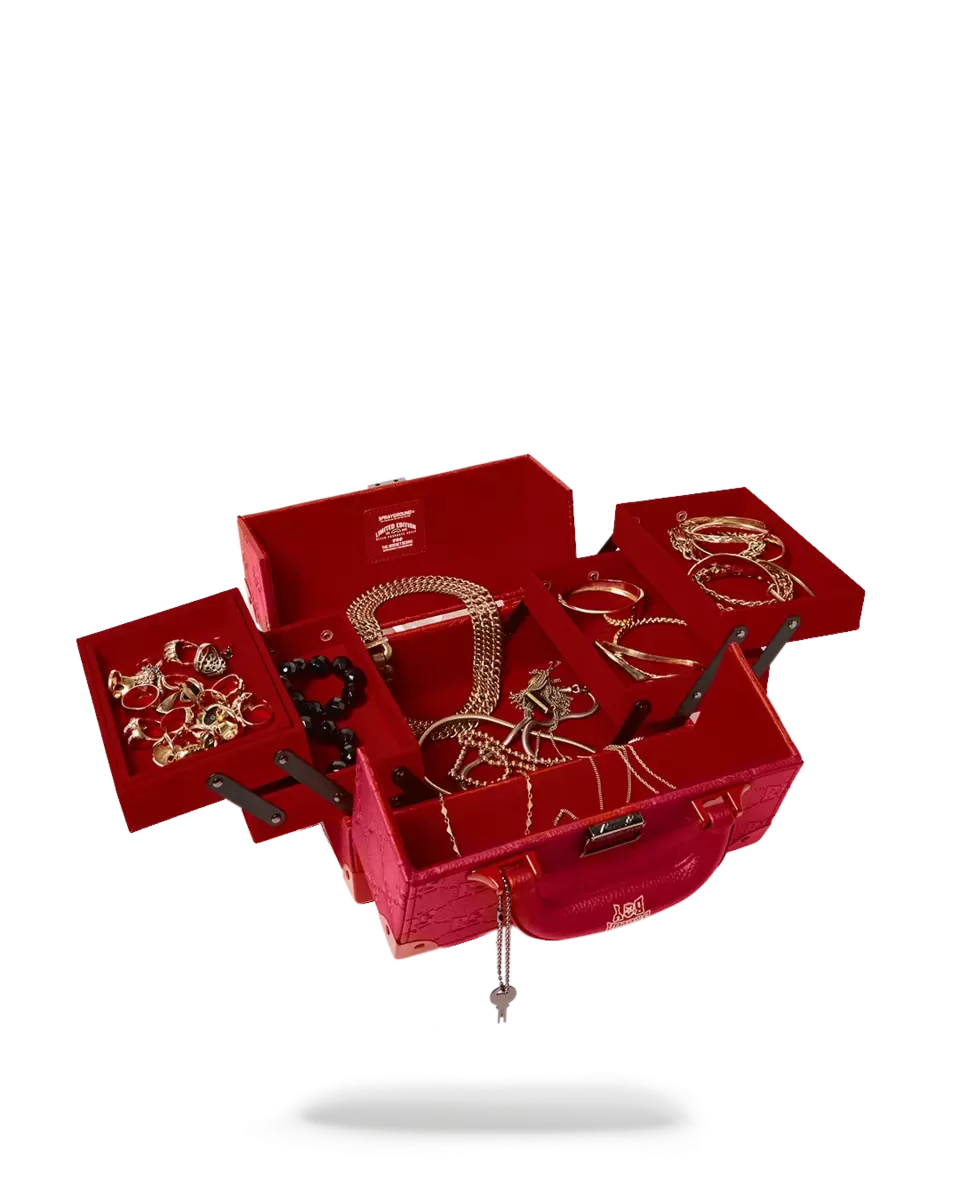 PRODUCT DETAILS 100% PU – embossed with Sprayground monogram Size 11, x 7, x 7, Red velour lining, Tiered shelving, removable tray, interior mirror.