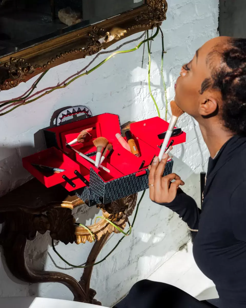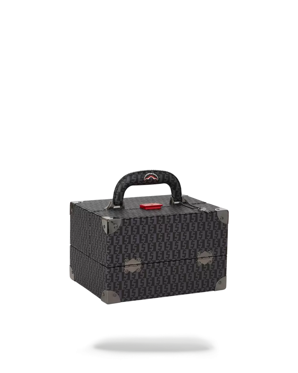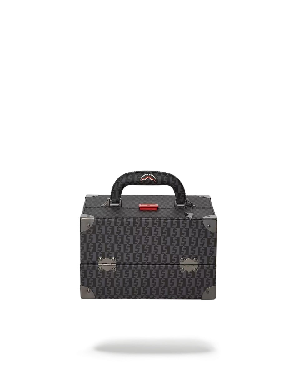 PRODUCT DETAILS 100% PU – embossed with Sprayground monogram Size 11, x 7, x 7, Red velour lining, Tiered shelving, removable tray, interior mirror.