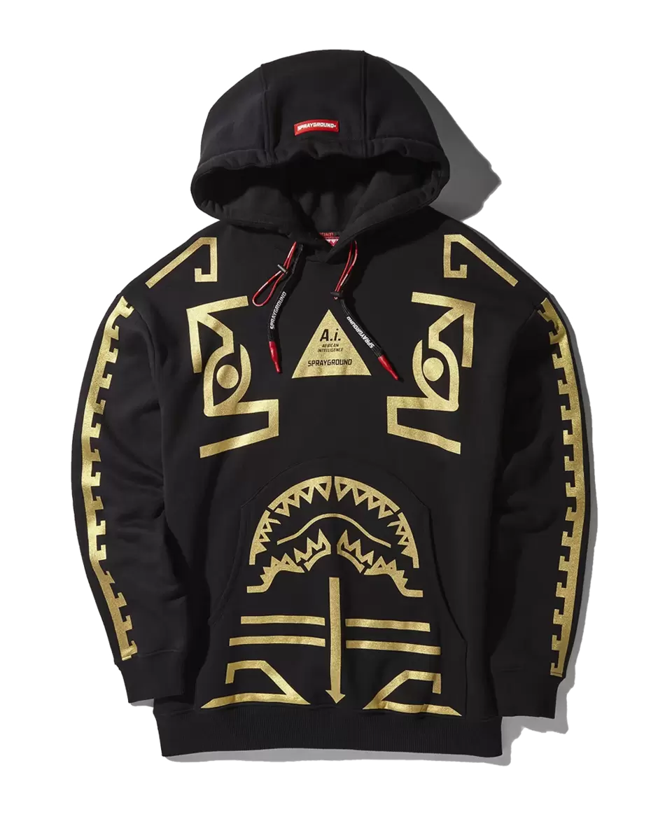 100% Cotton Black Gold Metallic Printed Accented with red drawstring details Kangaroo Front Pocket