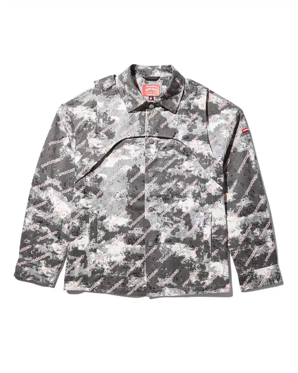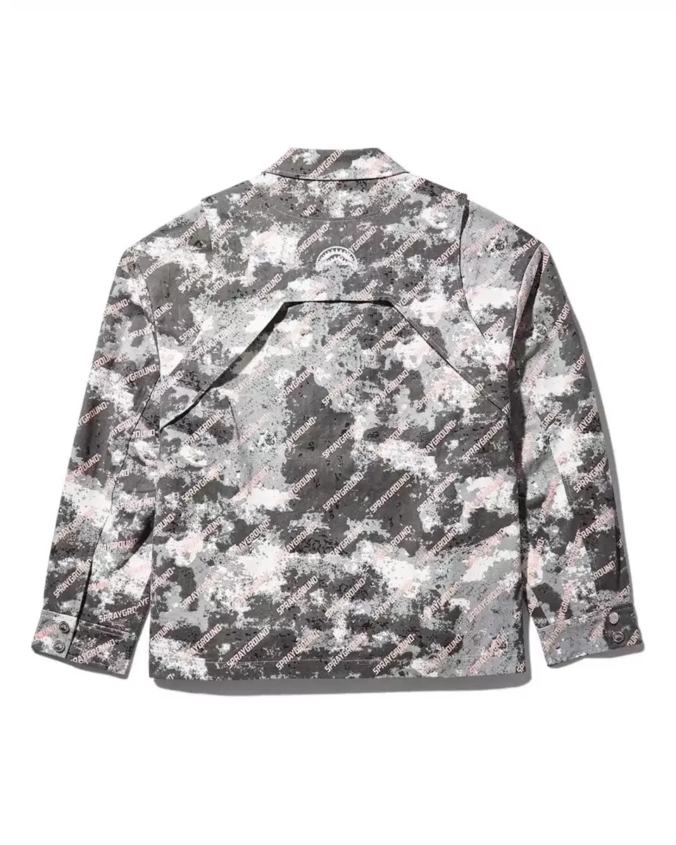 Button front closureDouble yoke at front and back with chest pocketSprayground Camouflage printSignature shark mouth at center backSprayground signature rubber emblem logo Vertical shark mouth tape at inside coat hook detail