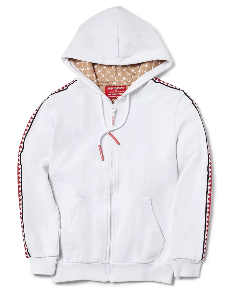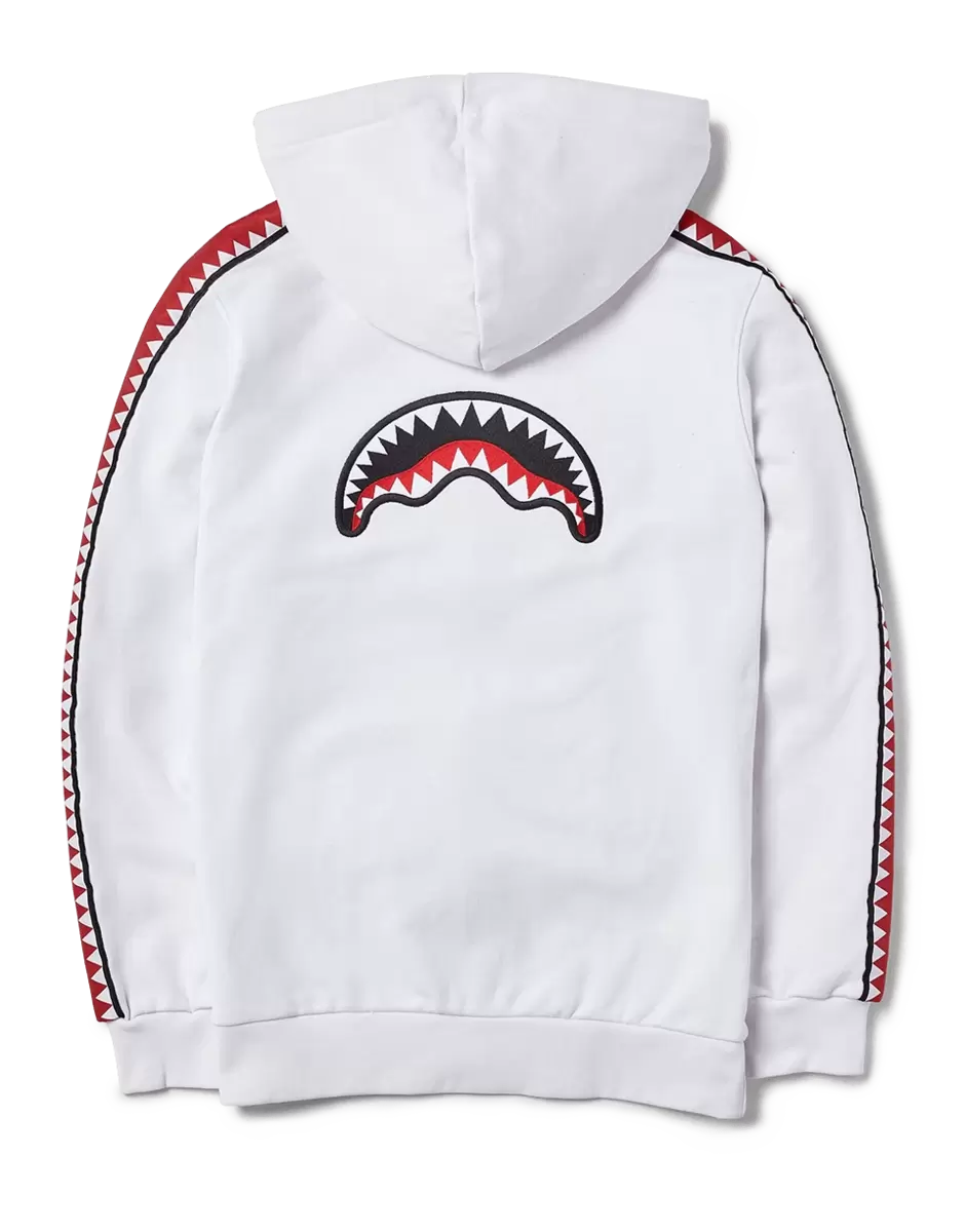 | 100% Cotton Zip front Hooded Sweatshirt Front Pocket Printed Lining detail in hood Drawstring Hood Embroidered Back Panel Vertical Shark Mouth taping on Sleeves |