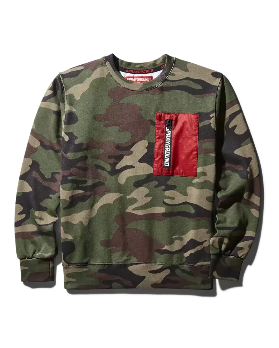 CAMOUFLAGE ROUND NECK CREW W REAR EMBROIDERED “YEAR OF THE TIGER” SPRAYGROUND GRAPHIC; RED POCKET W BLACK/WHITE LOGO
