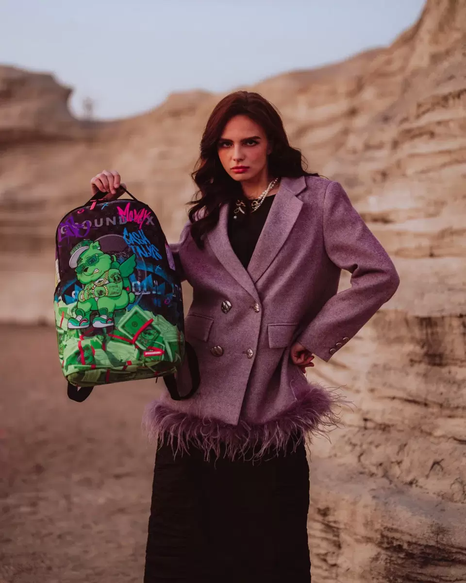 Dimensions: 18″ x 6″ x 11.5″ Front zipper pocket Side pockets Zippered Stash pocket Separate velour sunglass compartment Ergonomic mesh back padding Adjustable Straps for custom sizing Gold zippers with metal hardware Metal “Sprayground Authentic” badge Slide through back sleeve connects to carry-on luggage to free your hands