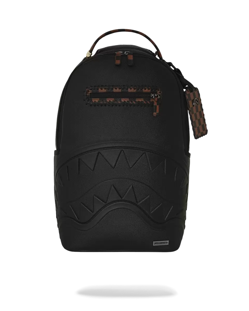 PVC bag with embossed details such as the sharkmouth, zipper pullers, and ID tag. Sewn faux leather details around the front zipper pocket and ID tag.