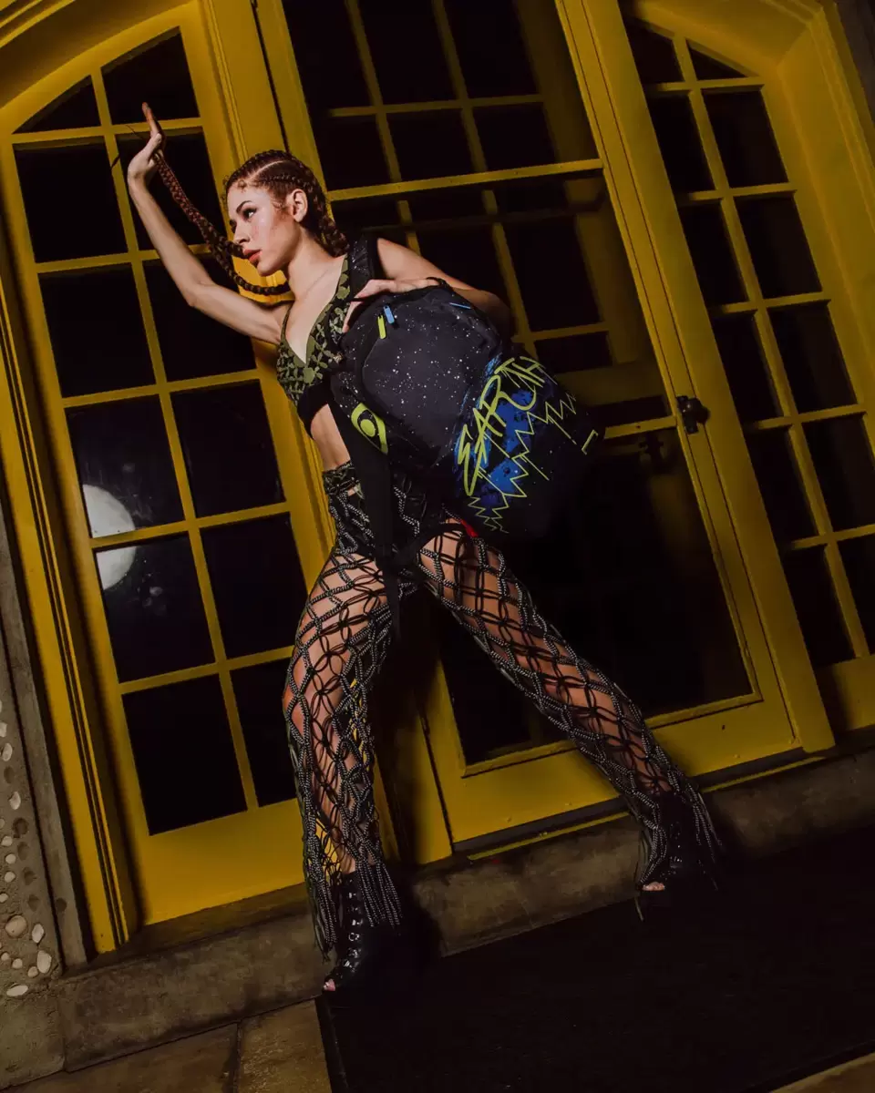 100% recycled polyester with glow in the dark printing Exterior Dimensions 18, x 6, x 11.5, Front zipper pocket, Side pockets, Zippered Stash pocket, Separ