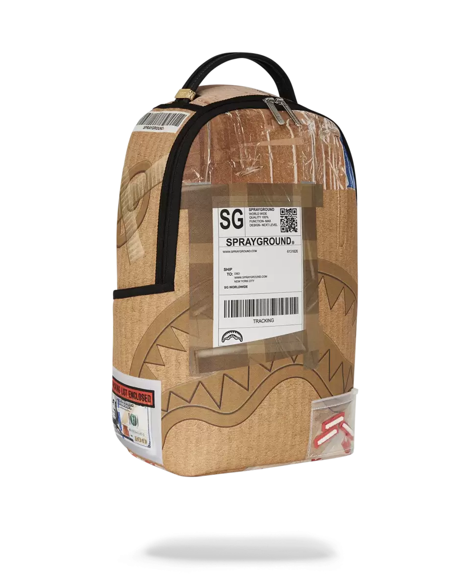 Ship your bag in SPRAYGROUND style! PVC backpack designed to look like a packed away box. Features zipper pocket with extra SPRAYGROUND emblems for decoration.