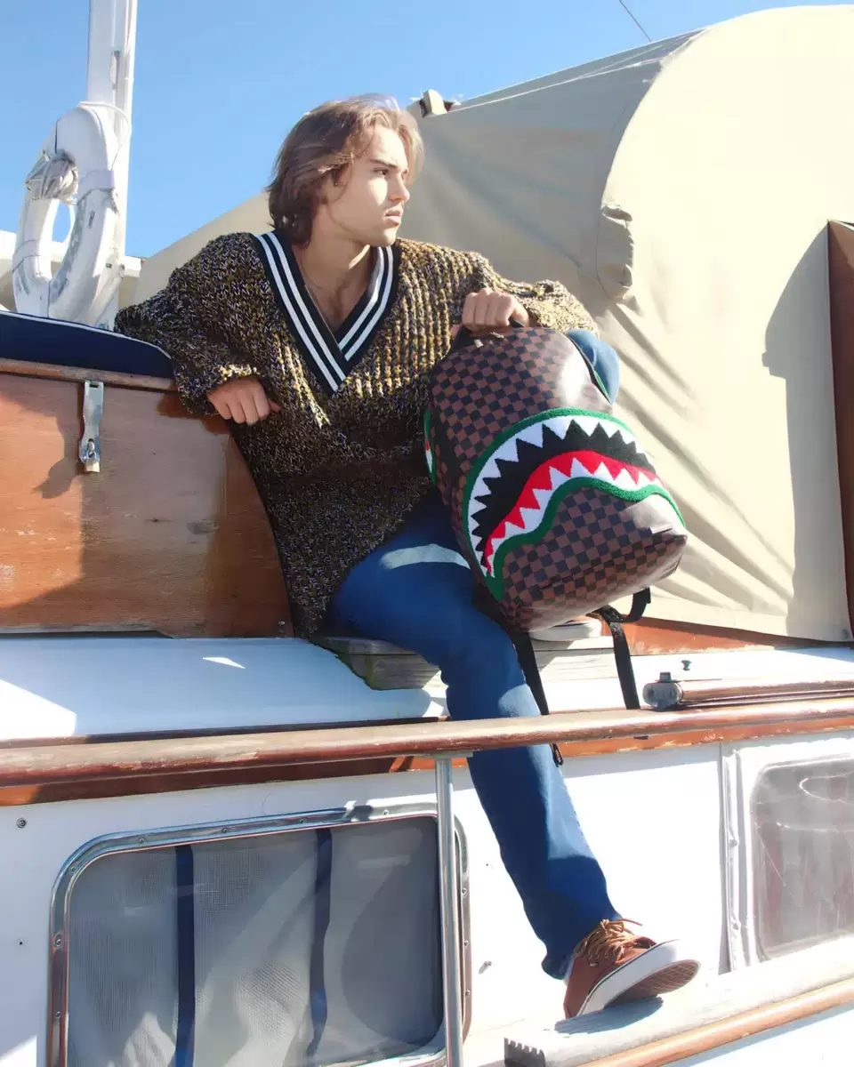 Dimensions: 18″ x 6″ x 11.5″ Front zipper pocket Side pockets Zippered Stash pocket Separate velour sunglass compartment Ergonomic mesh back padding Adjustable Straps for custom sizing Gold zippers with metal hardware Metal “Sprayground Authentic” badge Slide through back sleeve connects to carry-on luggage to free your hands