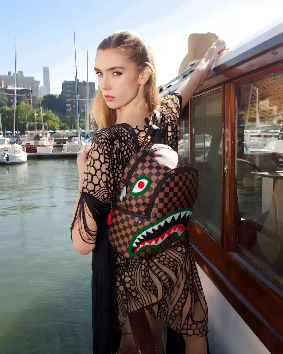 100% PVC Sharks in Paris check pattern on PVC material with textured chenille shark mouth on top featuring gold hardware