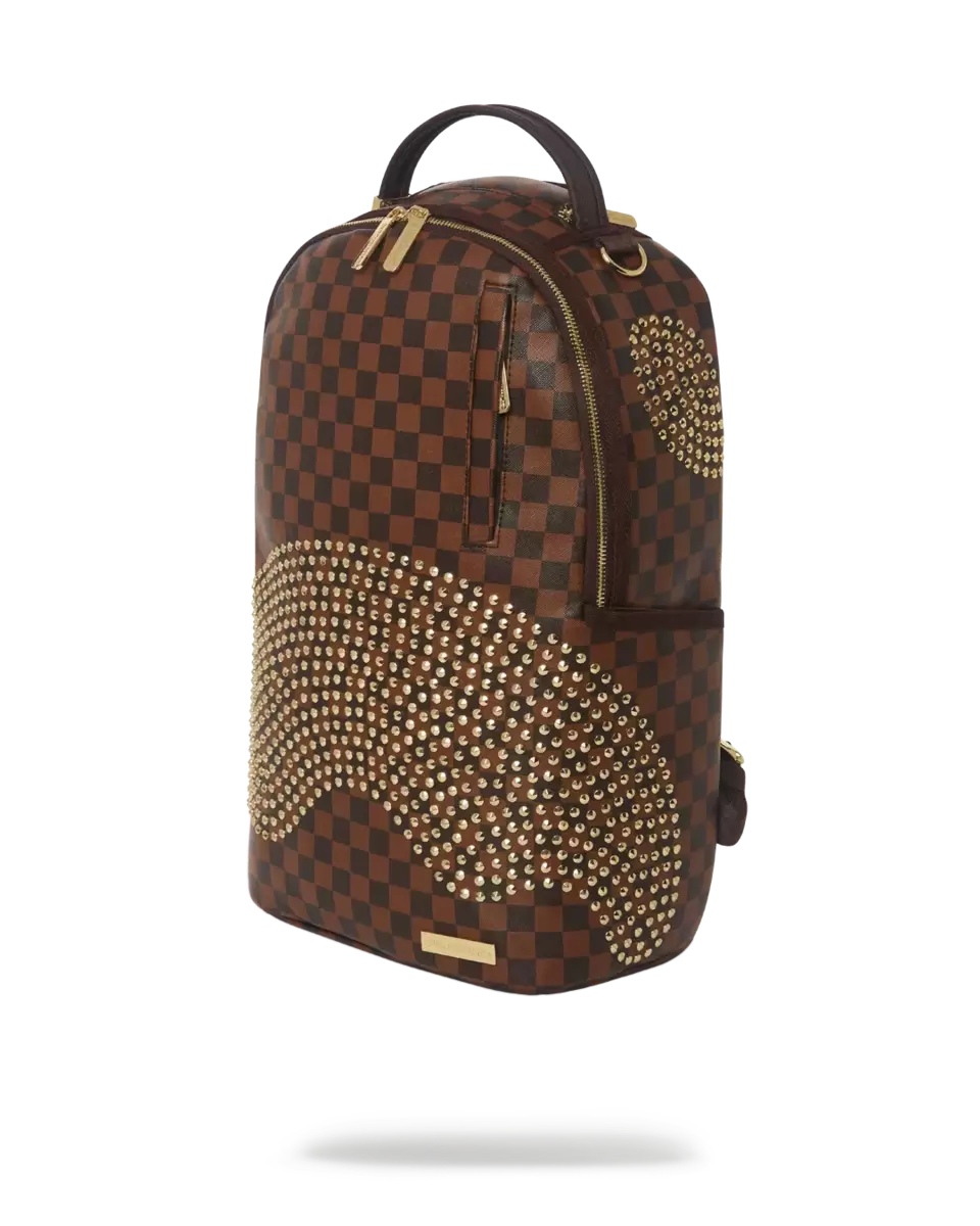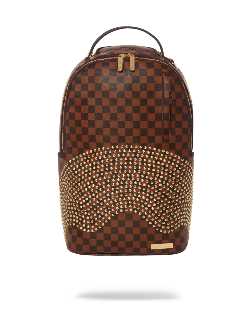 COVERED IN GOLD RIVETS Dimensions 18, x 6, x 11.5, Front zipper pocket, Side pockets, Zippered Stash pocket, Separate velour sunglass compartment, Ergonom