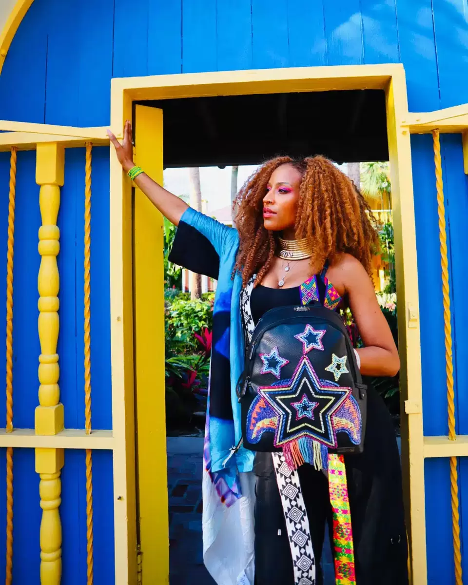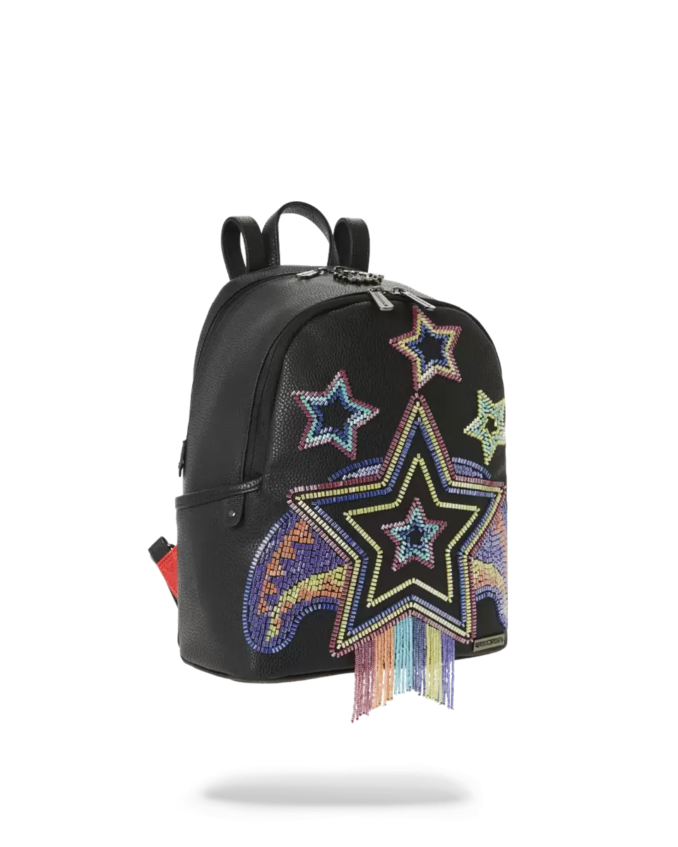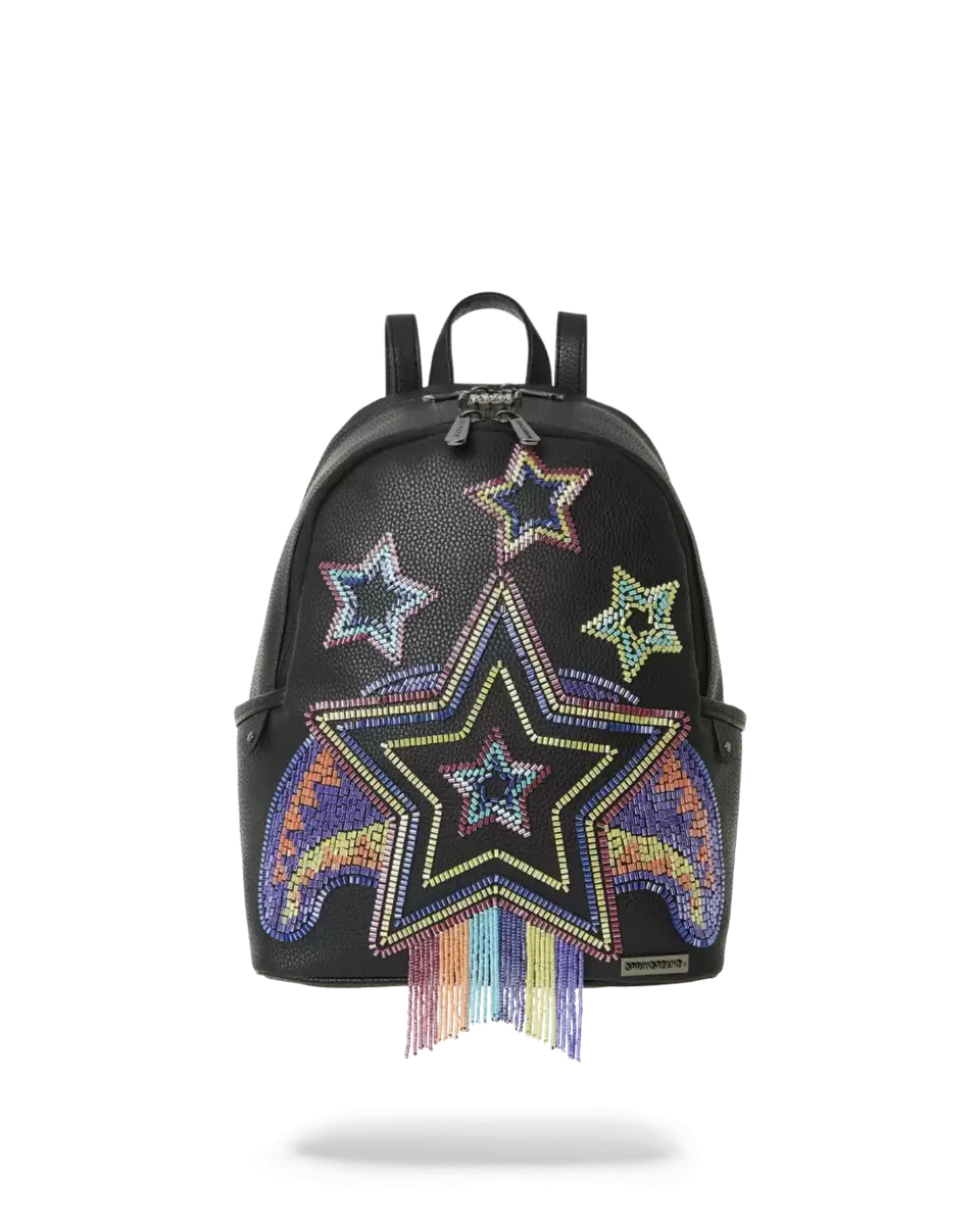 The coveted collection features the standout design; an eye-catching star print that is crafted from beads and is embedded perfectly on each of the items in this capsule . The Ai collection has been known for, vibrant purples, reds and yellows that speak to the colorful inspirations of Afro-futuristic art and culture. The exquisitely crafted beaded design speaks to this as well and is beautifully cascading off of Sprayground’s iconic collectible art piece – the shark mouth print on both backpacks.