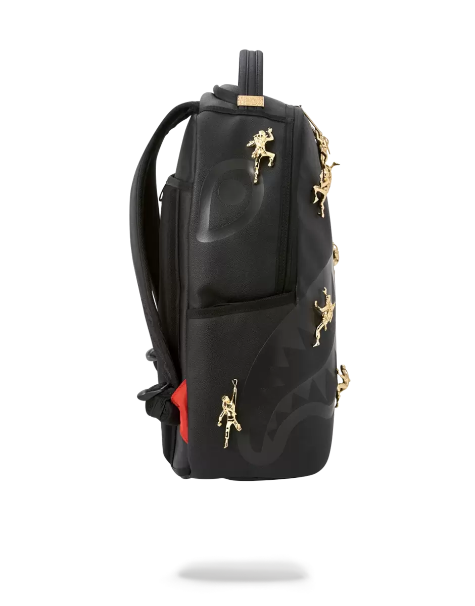11 Die-Case Gold Metal 3D Ninja’s Permanently Attached to the Backpack. Vegan Leather w/ Black Shark Bag. Dimensions: 18″ x 6″ x 11.5″ Gold ninjas and zippers with Gold metal hardware Front zipper pocket Side pockets Zippered Stash pocket Separate velour sunglass compartment Ergonomic mesh back padding Adjustable Straps for custom sizing Metal “Sprayground Authentic” badge Slide through back sleeve connects to carry-on luggage to free your hands