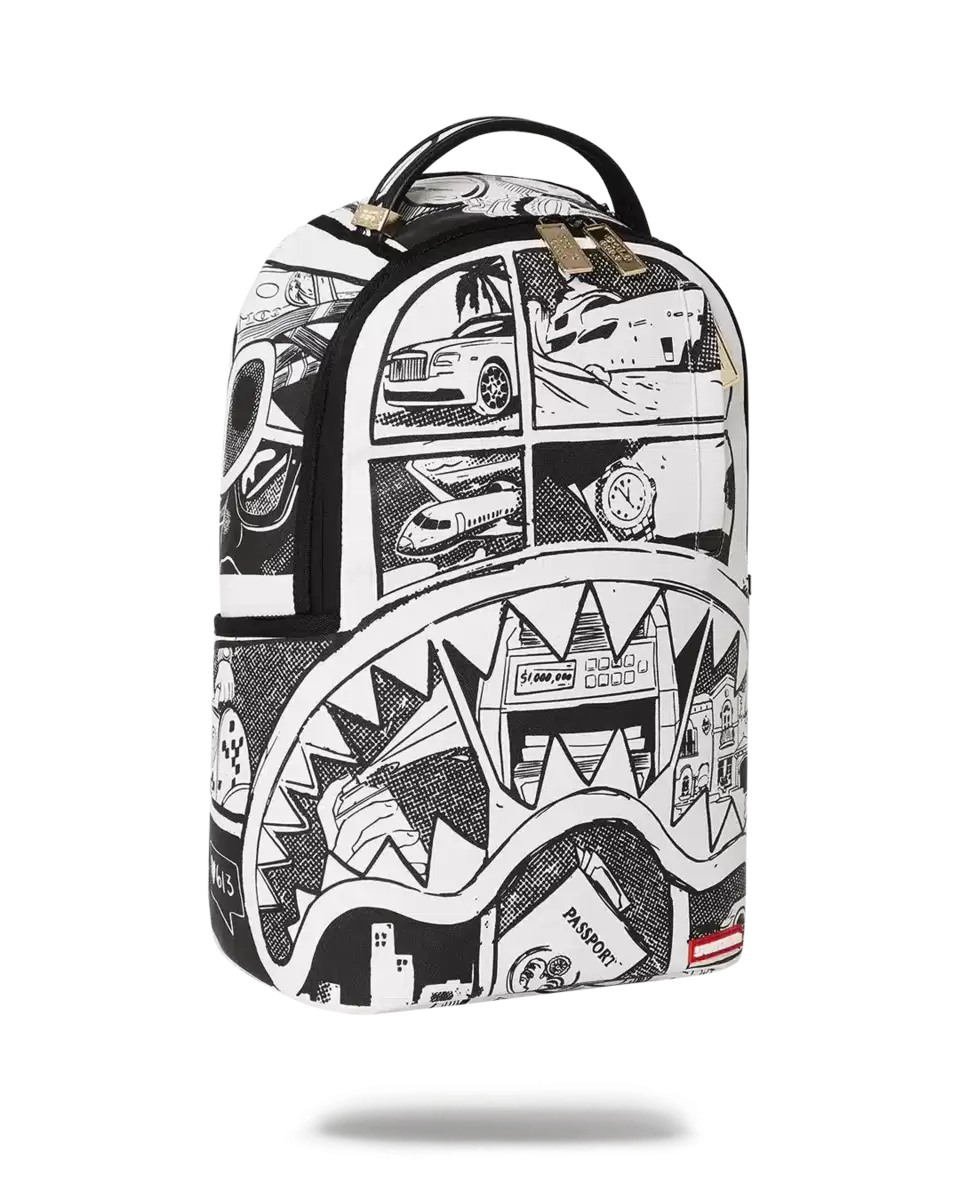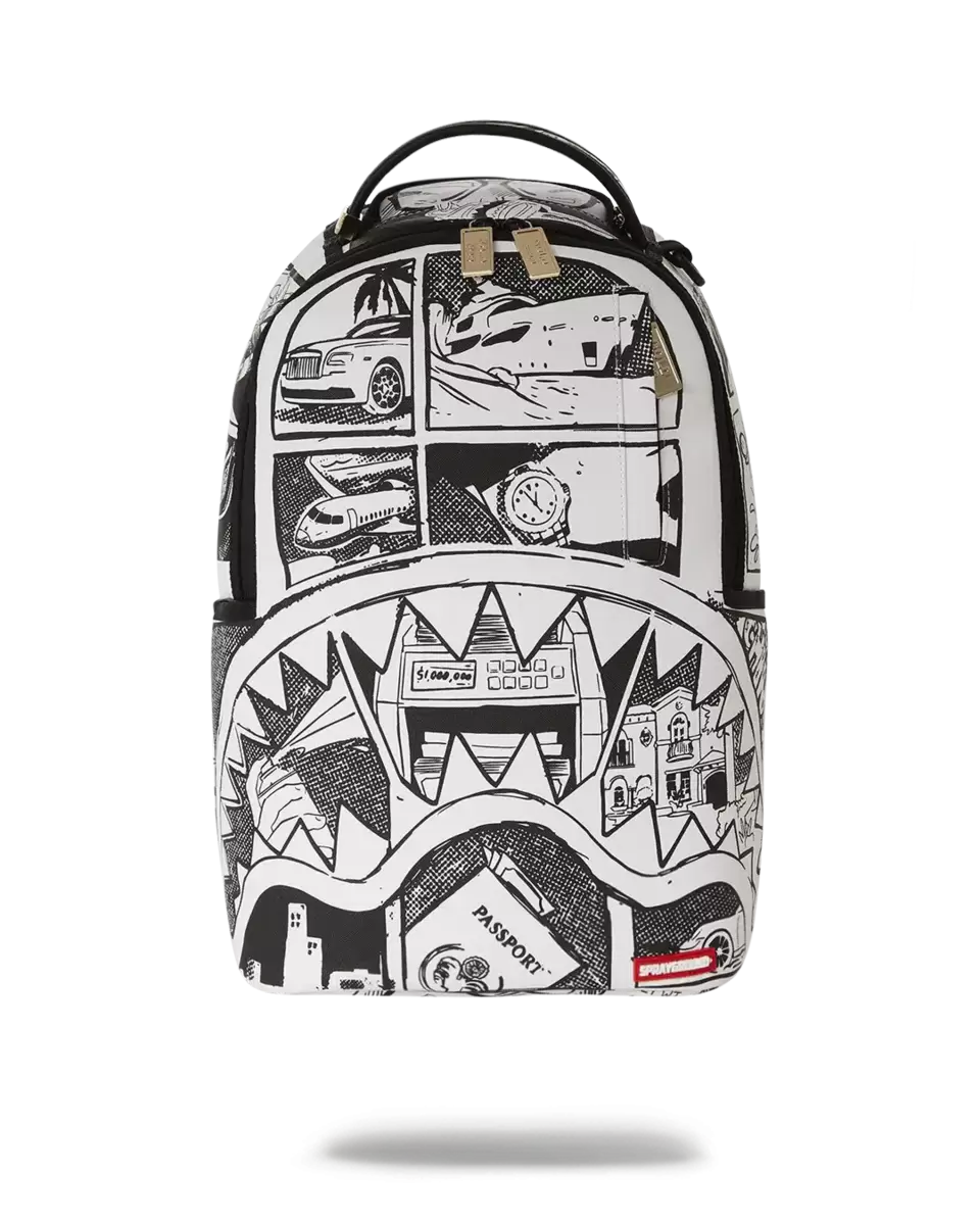 Dimensions: 18″ x 6″ x 11.5″ Front zipper pocket Side pockets Zippered Stash pocket Separate velour sunglass compartment Ergonomic mesh back padding Adjustable Straps for custom sizing Gold zippers with metal hardware Metal “Sprayground Authentic” badge Slide through back sleeve connects to carry-on luggage to free your hands
