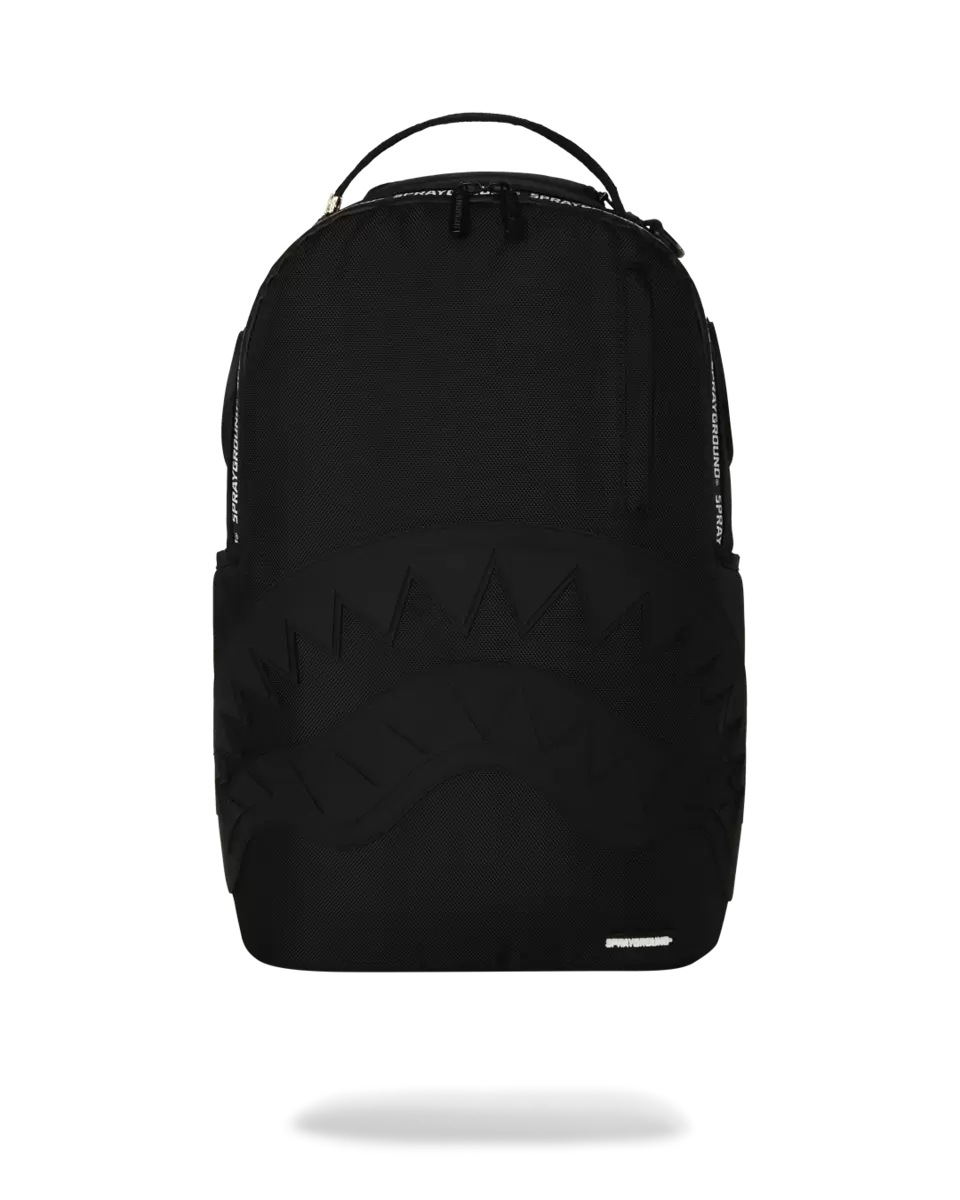 Ballistic polyester with SPRAYGROUND printed zipper tape and a rubber sharkmouth.