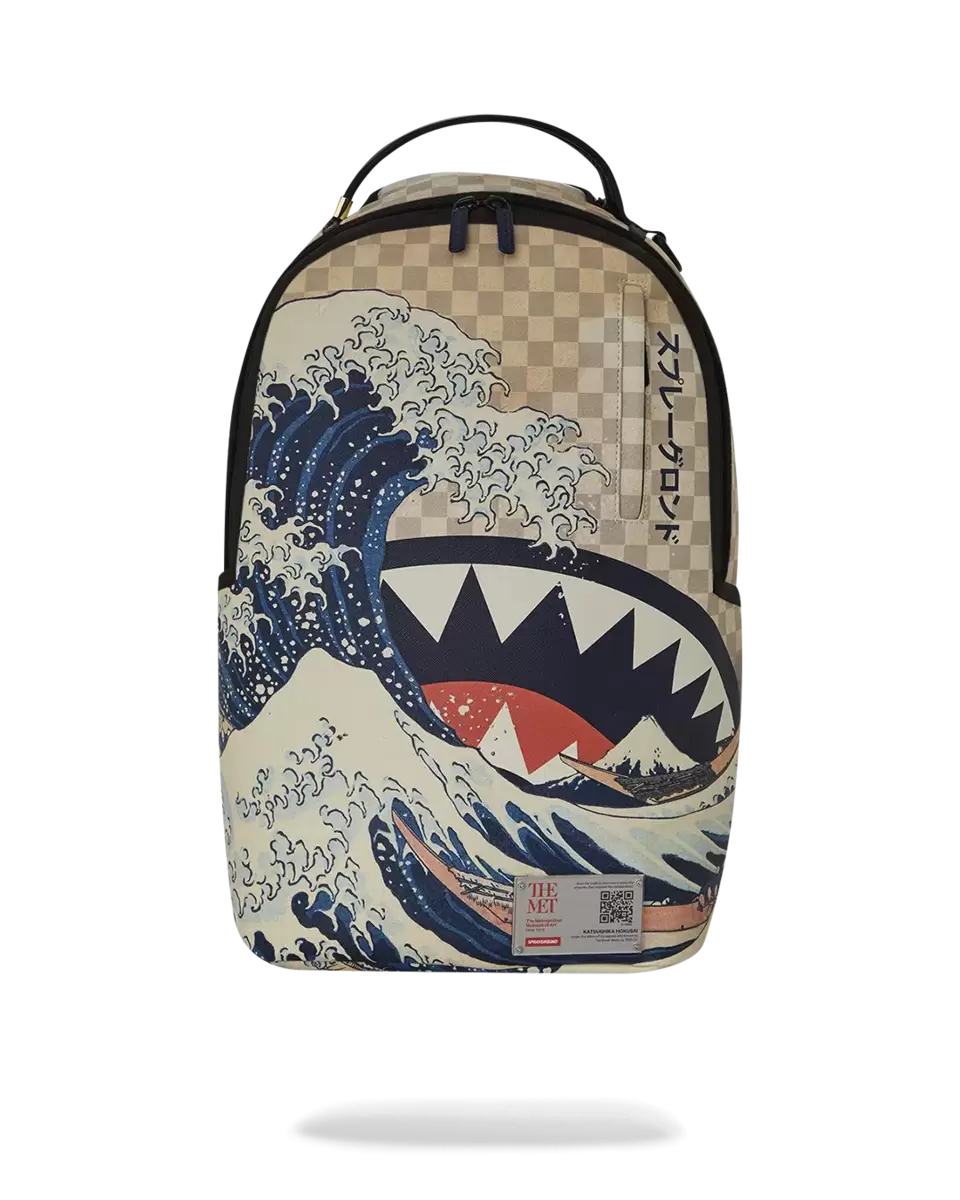 Two icons meet on this head-turning backpack featuring Sprayground’s signature shark mouth and Katsushika Hokusai’s (Japanese, 1760–1849) The Great Wave (ca. 1830–32). This timeless woodblock print in The Met’s Asian Art collection captures a formidable, foaming breaker towering over tiny boats of fishermen bracing for impact.