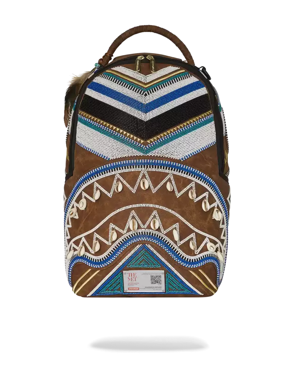 A beaded headdress, or mpaan, crafted in the Kuba kingdom (present-day Democratic Republic of Congo) during the 19th–20th century, informs the detailing on this artful backpack with Sprayground’s shark mouth integrated into the design. Such a headdress, worn during funerals and ceremonial occasions, would have been a visible indication of one’s rank within the elaborate Kuba social system. The mpaan was specifically reserved for senior female titleholders. This backpack has been delicately crafted with beads and shells in honor of the original.
