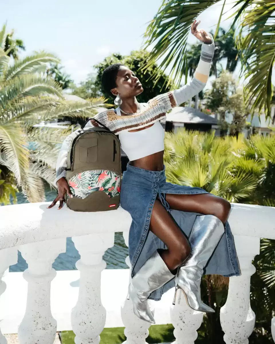 100% Cotton green army canvas over custom printed PVC leather mouth with fringe details Features an exterior cargo pocket & a vertical zipper pocket Exterior Di