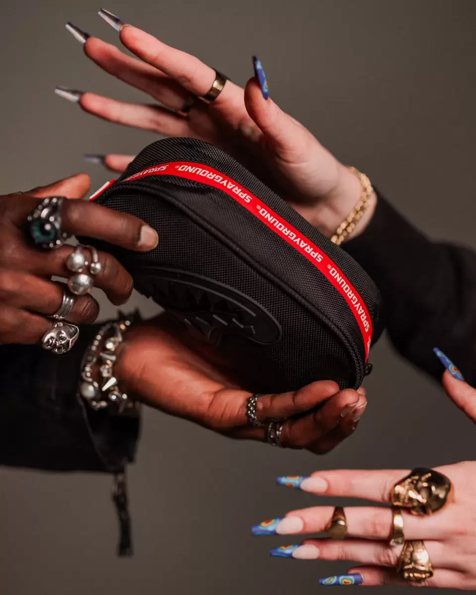 Ballistic polyester with SPRAYGROUND printed zipper tape and a rubber sharkmouth.