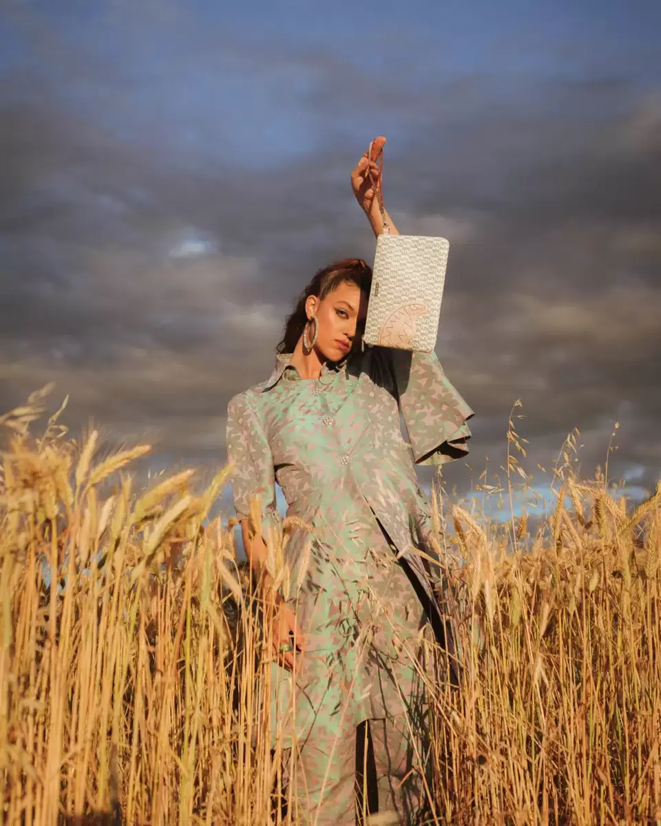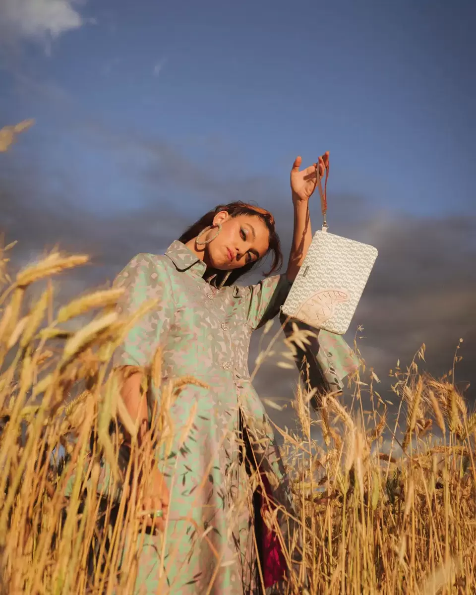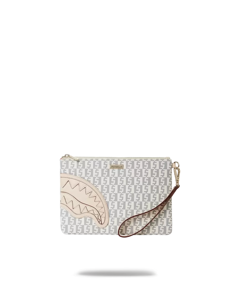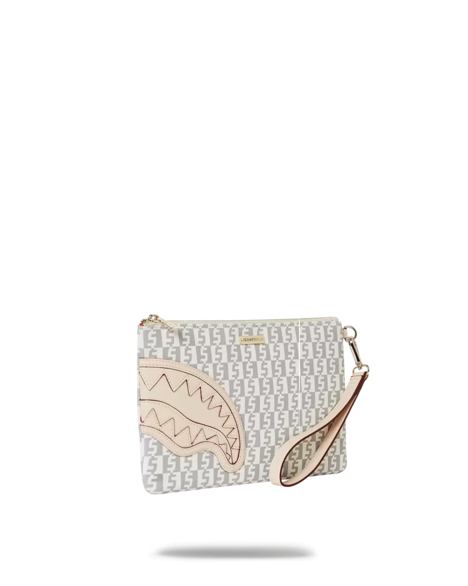 Pouch with removable wristlet strap, Handle on front panel, Zip Closure1 interior pocket7″ X 10″ X 0.25″