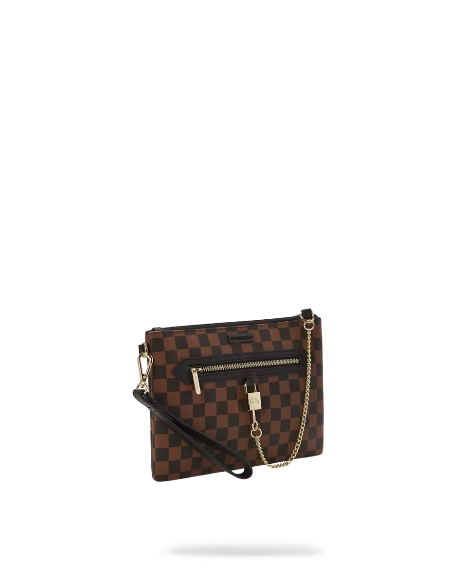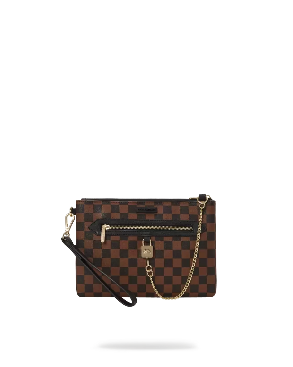 Pouch with removable wristlet strap, Handle on front panel, Zip Closure1 interior pocket7″ X 10″ X 0.25″