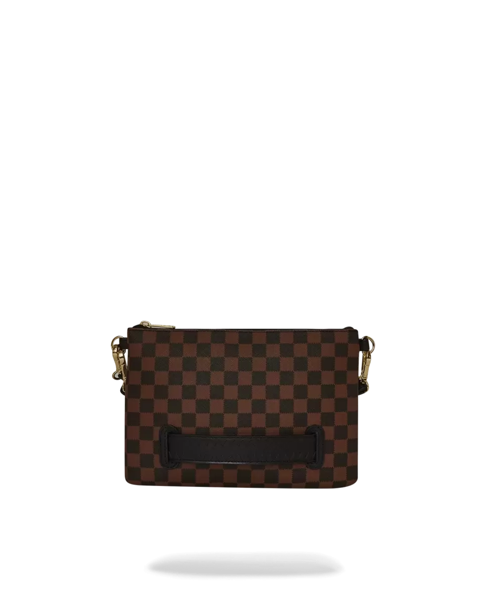 Cut and sew sharkmouth Convertible Clutch “Pouchette” Pouch with removable wristlet strap, Handle on front panel, Zip Closure1 interior pocket7, X 10, X 0.25,