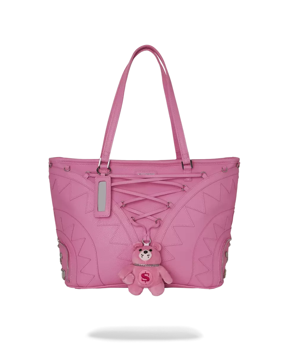 PVC with double sharkmouth cut and sew details, features decorative zipper detailing which includes a plush bear hanging from the center, laced pvc trim, side panels are decorated with silver metal studs, and a hanging mirror keychain