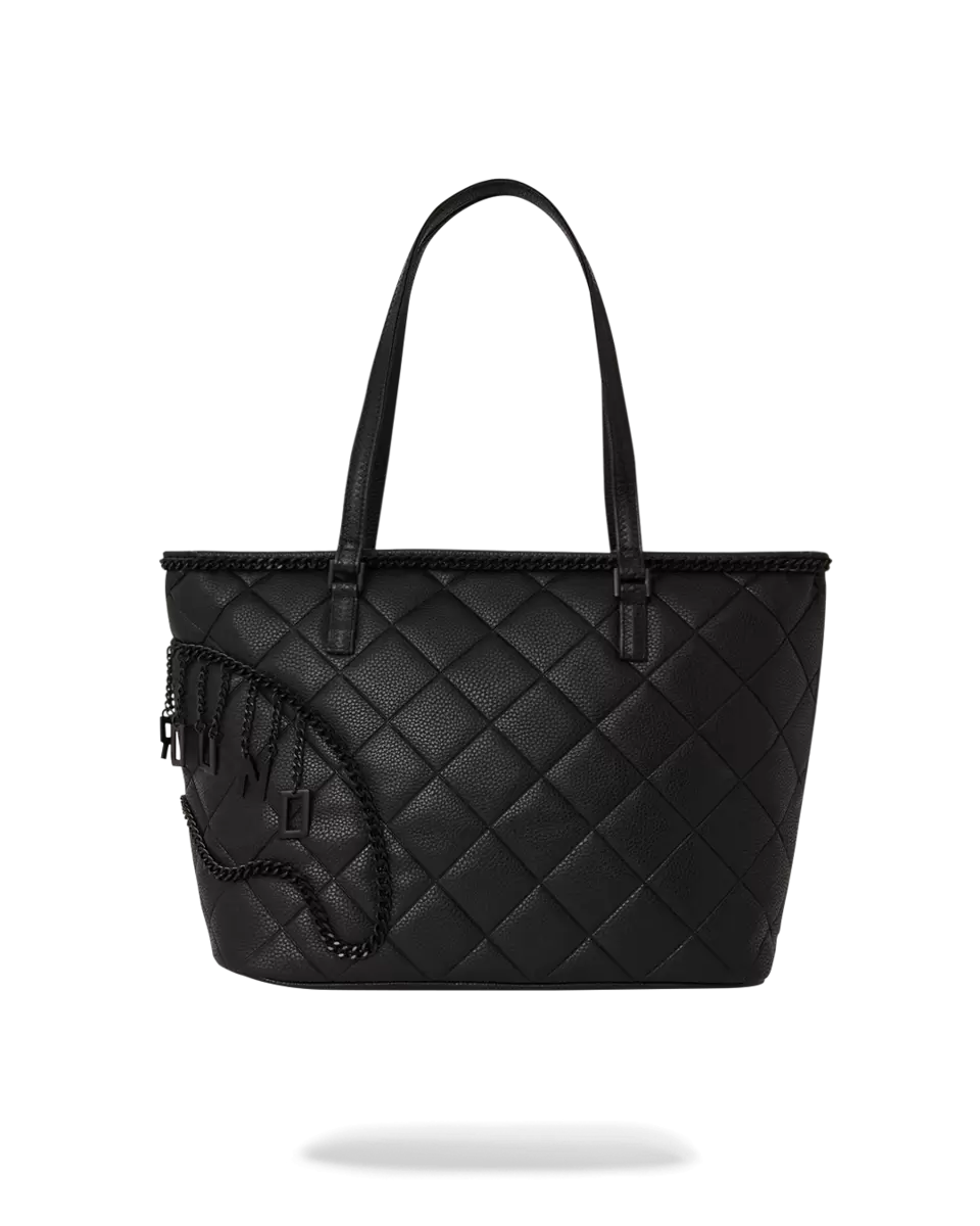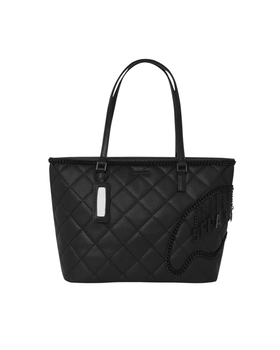 100% PVC quilted black faux leather featuring black chain hardware and hanging charm logo.