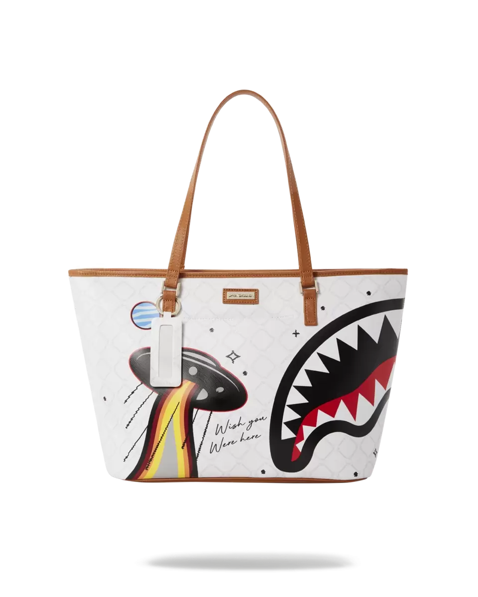 Your over the shoulder bag doesn’t have to be boring anymore. Stand out with the printed Sprayground Totes. Includes Sprayground Logo Keychain Mirror. Dimension