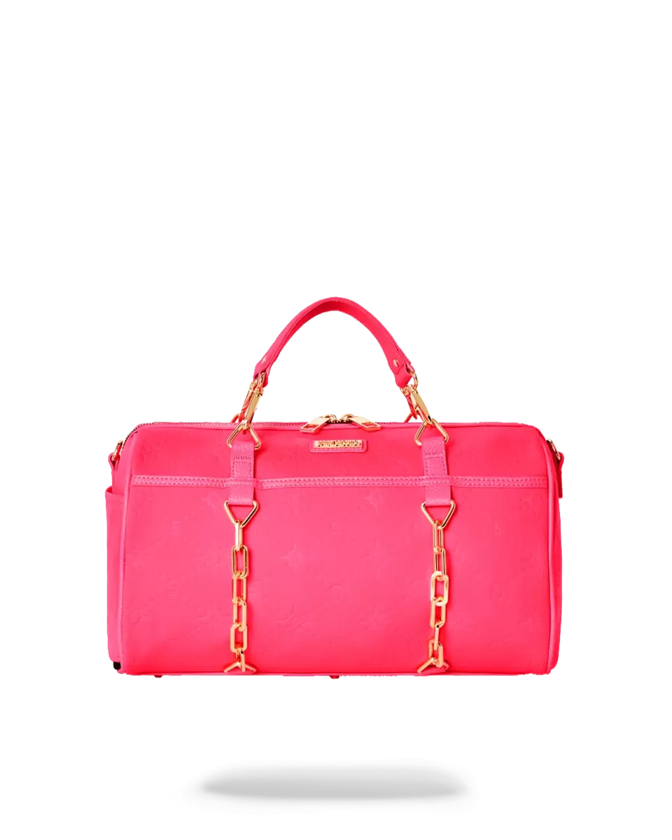 Sporty neoprene fabric embossed with custom Sprayground logo pattern. The styles are trimmed with matching faux leather trims and elevated with gold chain accen