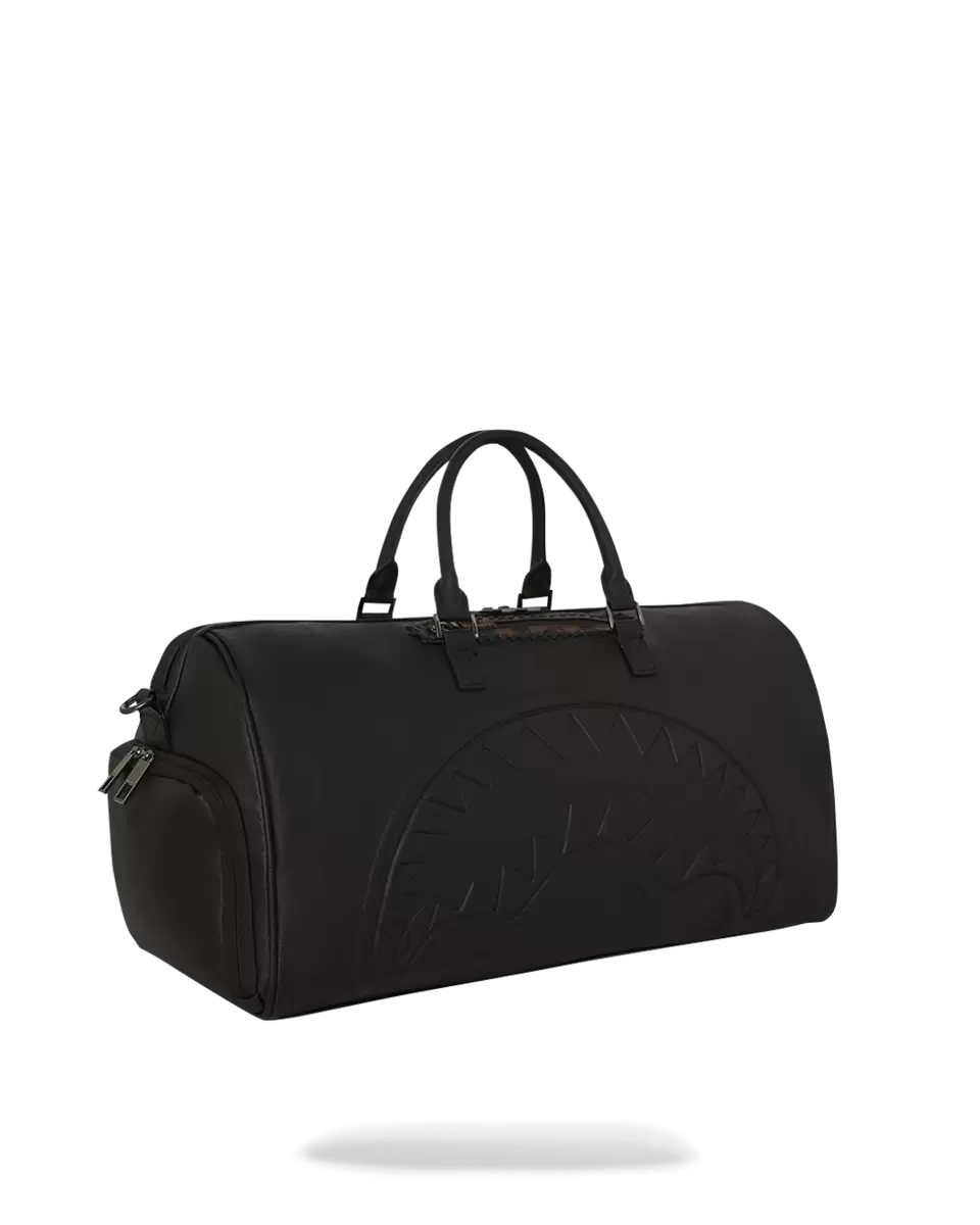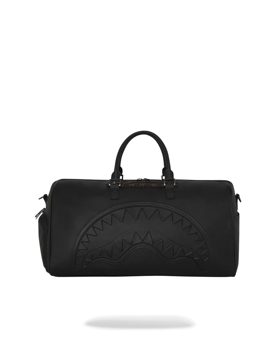 PVC bag with embossed details such as the sharkmouth and zipper pullers Sewn faux leather details around the front zipper pocket.