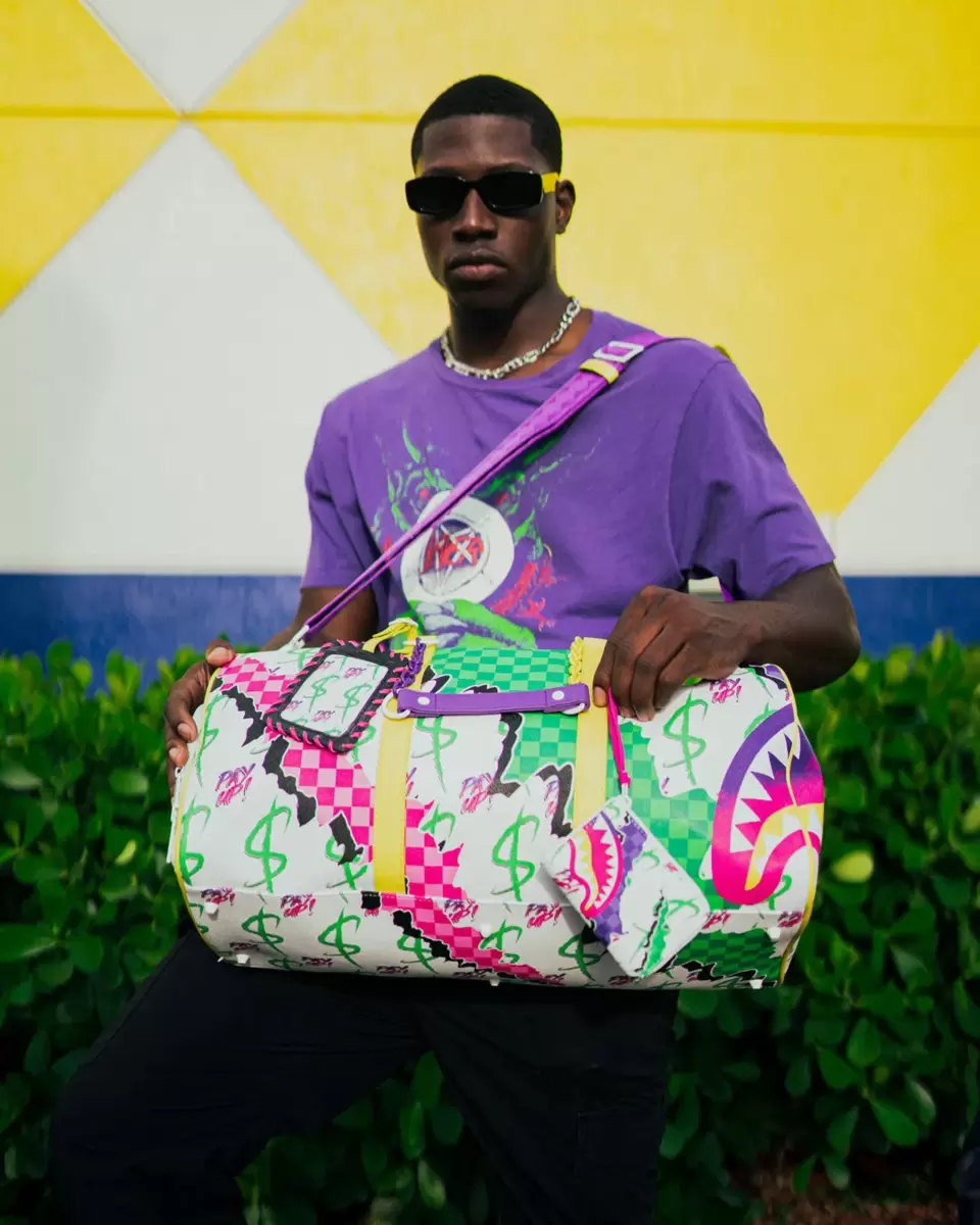 Dimensions: 20″ x 10″ x 10.75″ Metal zipper pocket Back Zippers Zippered sneaker pocket gold zippers Adjustable Straps for custom sizing Metal Zippers with Metal Hardware bag of Sprayground money