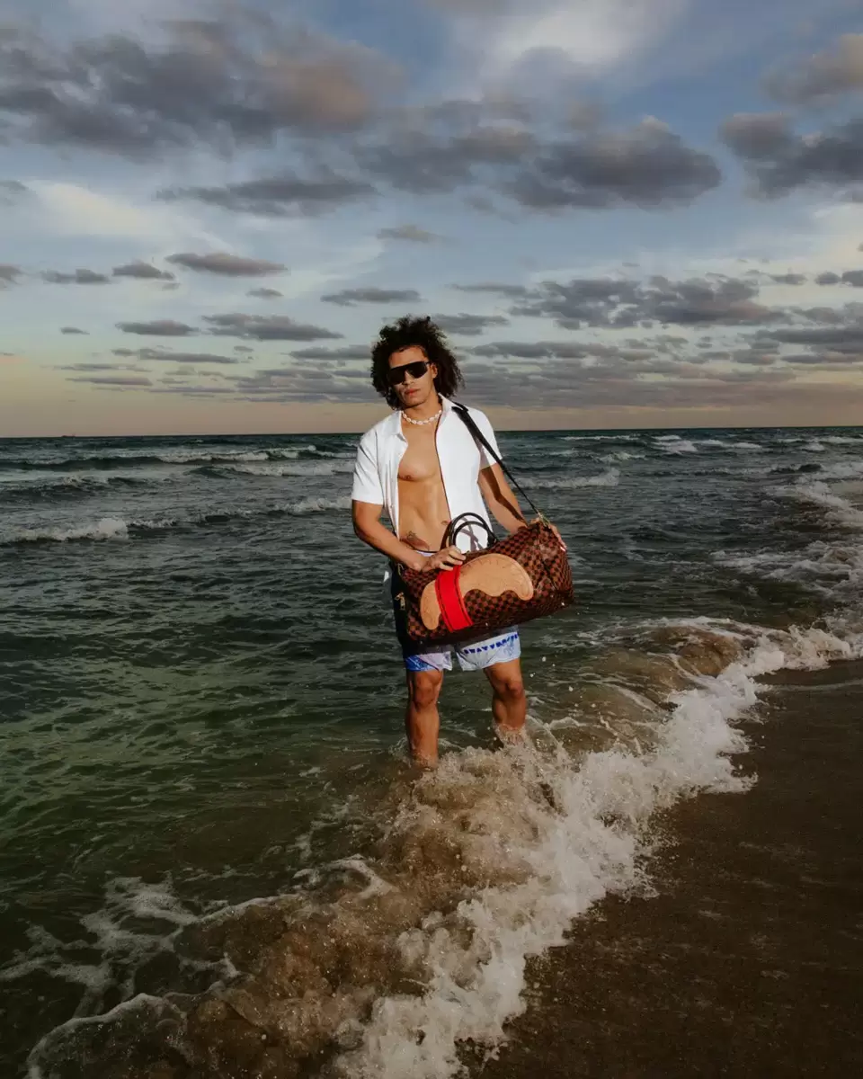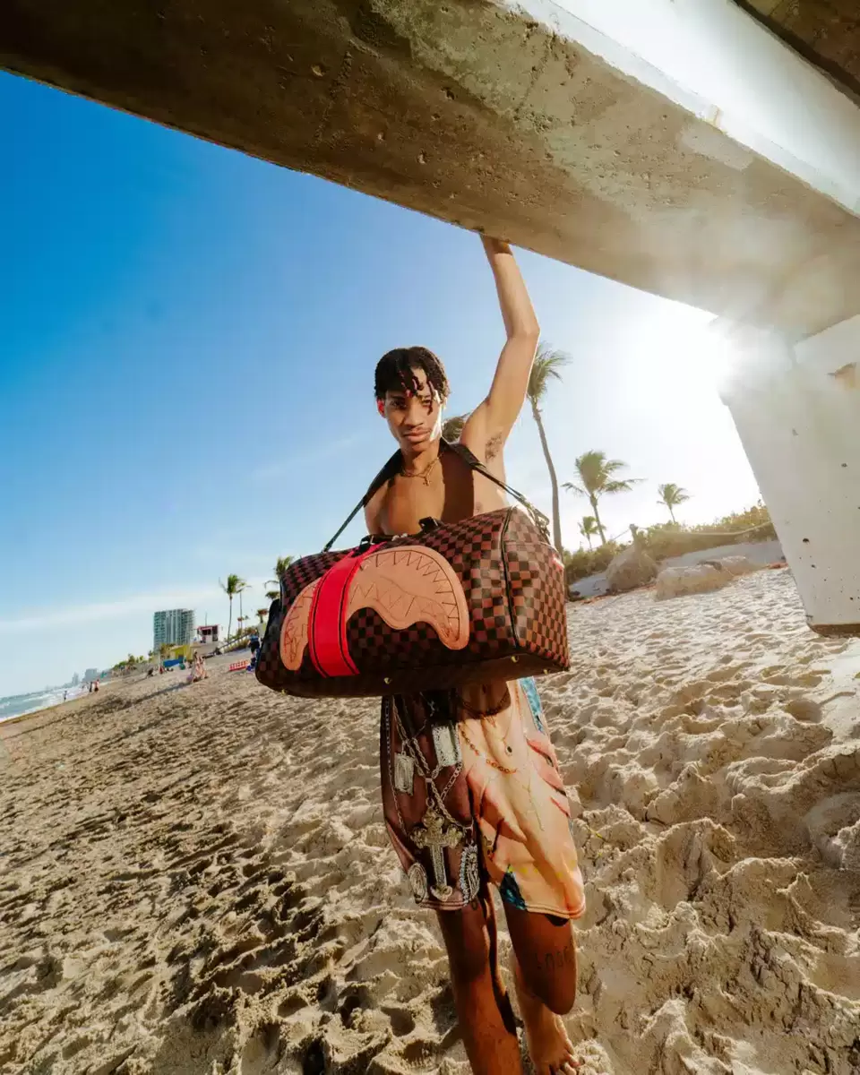 Dimensions: 20″ x 10″ x 10.75″ Metal zipper pocket Back Zippers Zippered sneaker pocket gold zippers Adjustable Straps for custom sizing Metal Zippers with Metal Hardware bag of Sprayground money