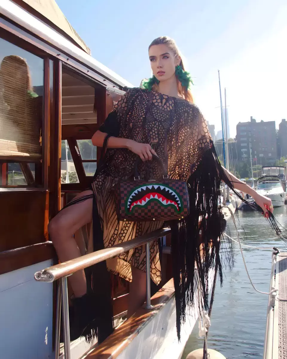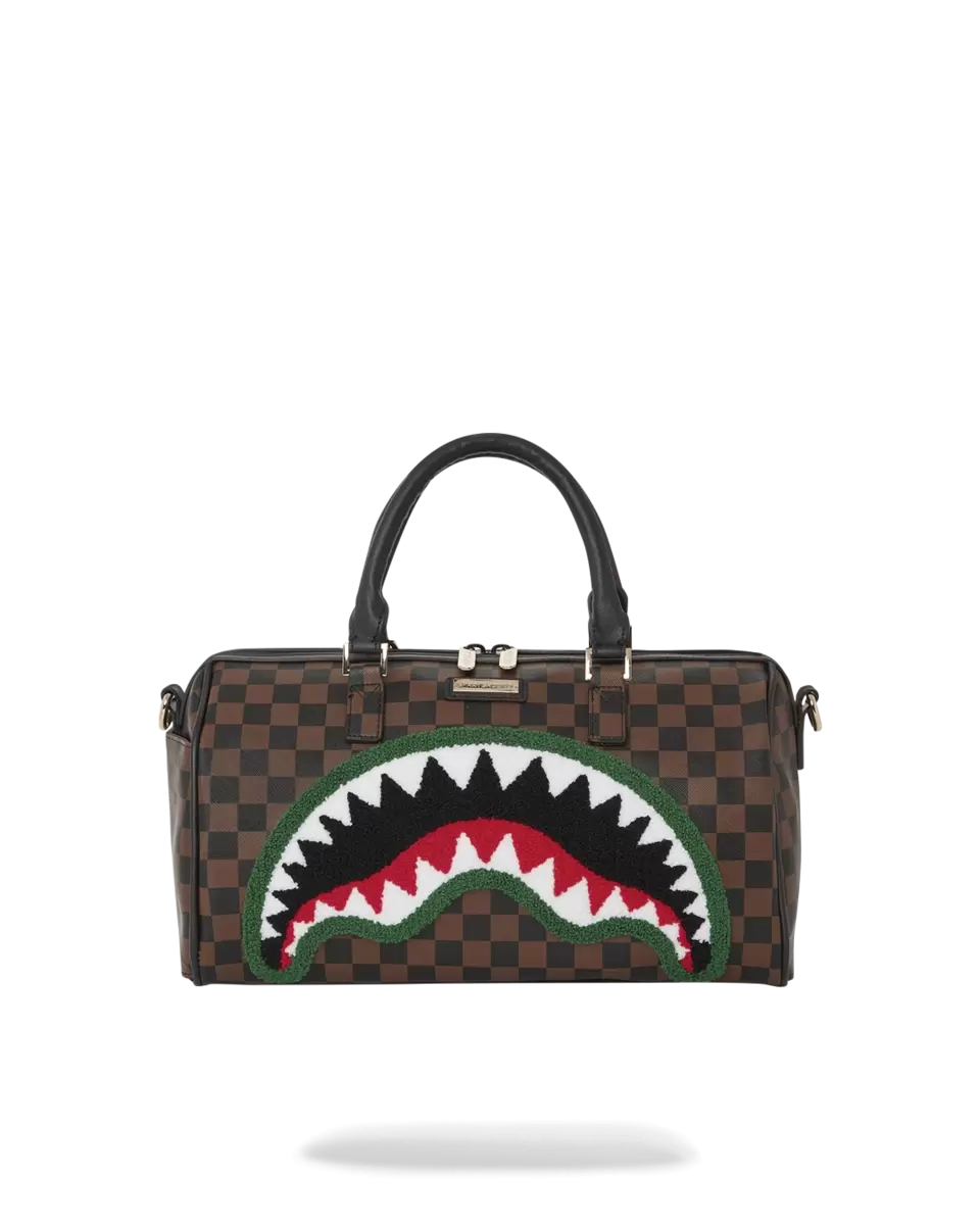 100% PVC Sharks in Paris check pattern on PVC material with textured chenille shark mouth on top featuring gold hardware
