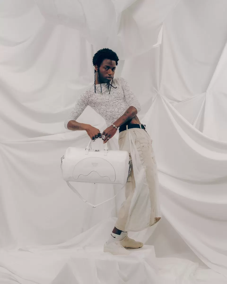 Cut and sew sharkmouth shape with embossed silver foil lettering.