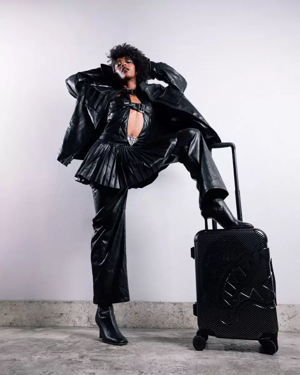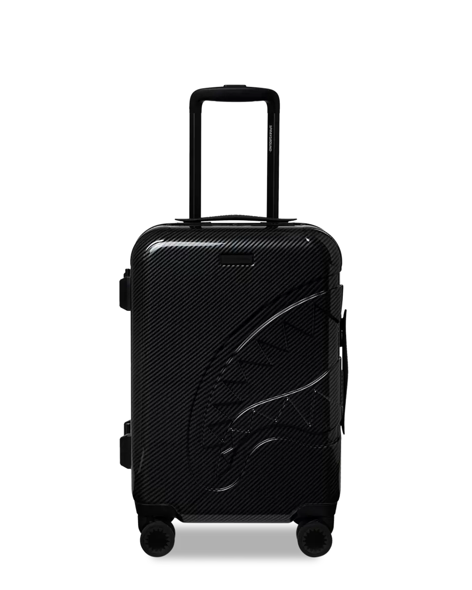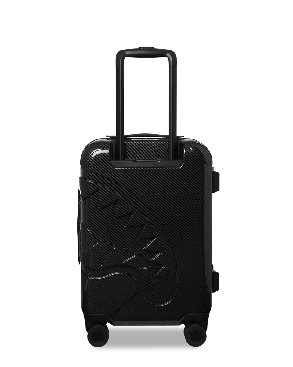 Faux carbon fiber carry-on luggage. Features an embossed sharkmouth.