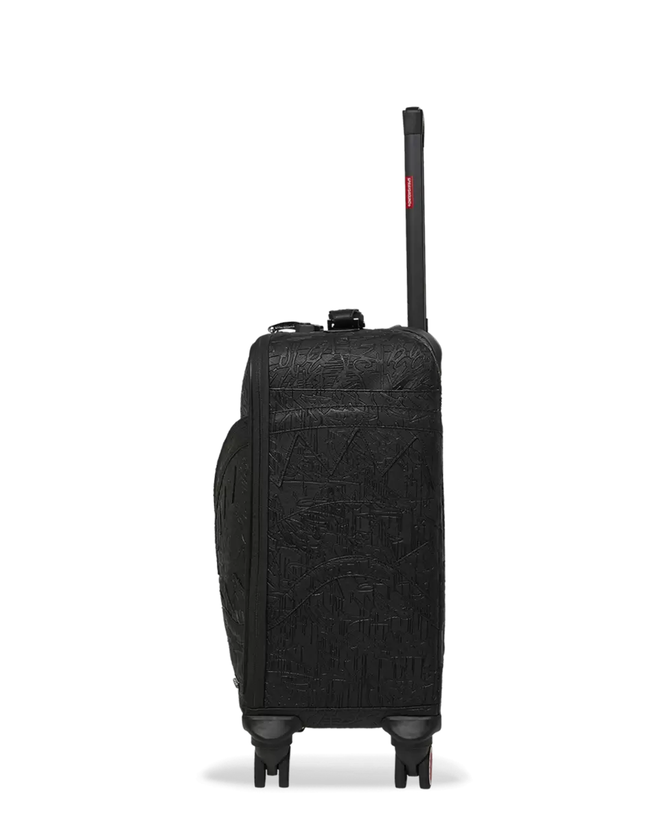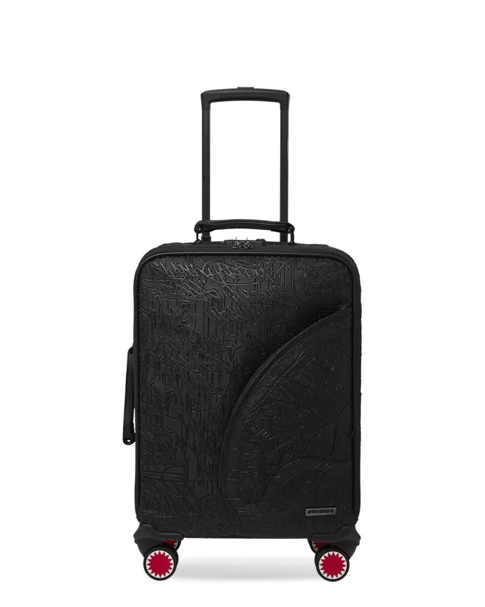 EXTERIOR:100 % Polyvinyl Chloride Shell – AKA 100% Faux Leather H: 19.5” x W: 14.5“x D: 7” YKK® Zipper FrameFront Exterior PocketEmbossed LogoFaux leather top & side handles 4 Dual Spinning Recessed WheelsTelescope Adjustable Handle – 2 positions INTERIOR:Multiple Pockets and Compartments for Maximum Organization3 Zippered Pocket4 Mesh PocketsShark Print Satin LiningMesh organizer pockets Fastening StrapsNylon Zippers with Metal Hardware