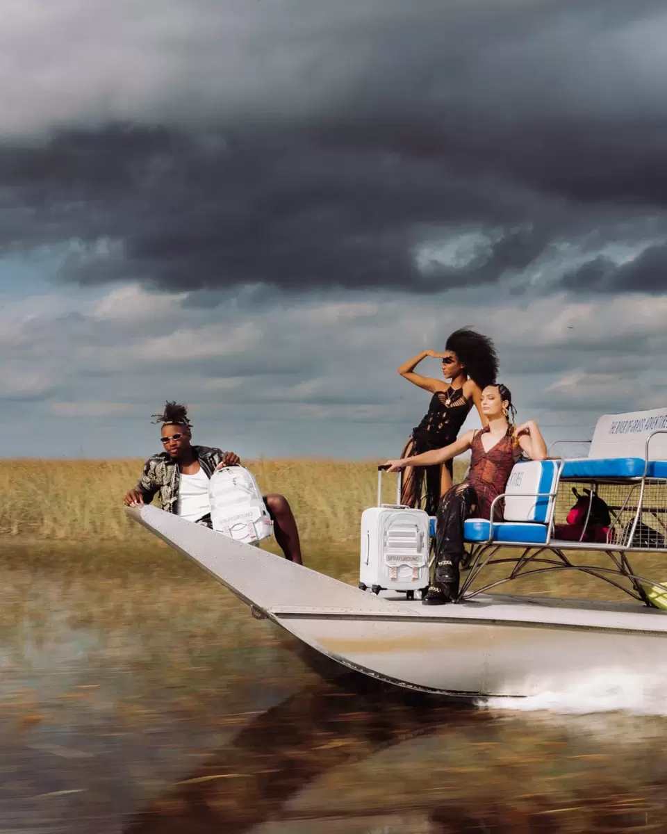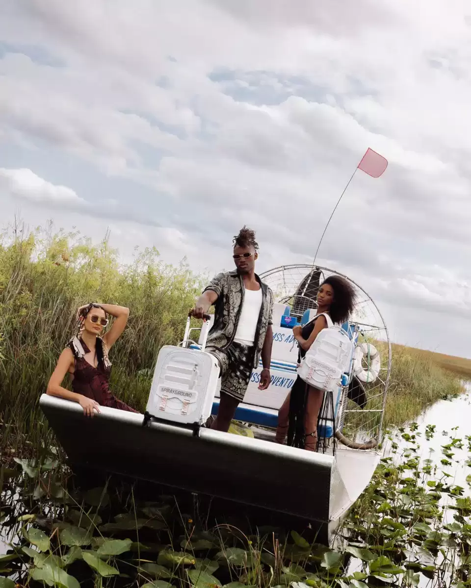 EXTERIOR:100 % Polyvinyl Chloride Shell – AKA 100% Faux Leather H: 19.5” x W: 14.5“x D: 7” YKK® Zipper FrameFront Exterior PocketEmbossed LogoFaux leather top & side handles 4 Dual Spinning Recessed WheelsTelescope Adjustable Handle – 2 positions INTERIOR:Multiple Pockets and Compartments for Maximum Organization3 Zippered Pocket4 Mesh PocketsShark Print Satin LiningMesh organizer pockets Fastening StrapsNylon Zippers with Metal Hardware