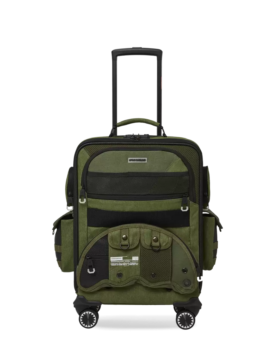 Embellished with Shark Shape cargo pockets, grommet & clips.H: 19.5” x W: 14.5“x D: 7” YKK® Zipper FrameFront Exterior PocketEmbossed LogoFaux leather top & side handles 4 Dual Spinning Recessed WheelsTelescope Adjustable Handle – 2 positions INTERIOR:Multiple Pockets and Compartments for Maximum Organization3 Zippered Pocket4 Mesh PocketsShark Print Satin LiningMesh organizer pockets Fastening StrapsNylon Zippers with Metal Hardware